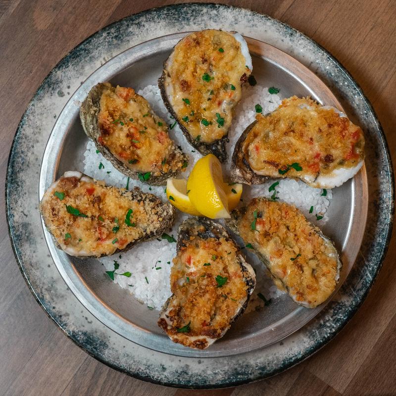 Baked oysters topped with classic Bienville sauce, garlic, peppers, bacon and chives