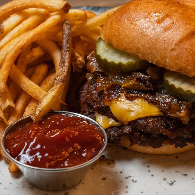 Topped with American cheese, caramelized onion jam, and pickles